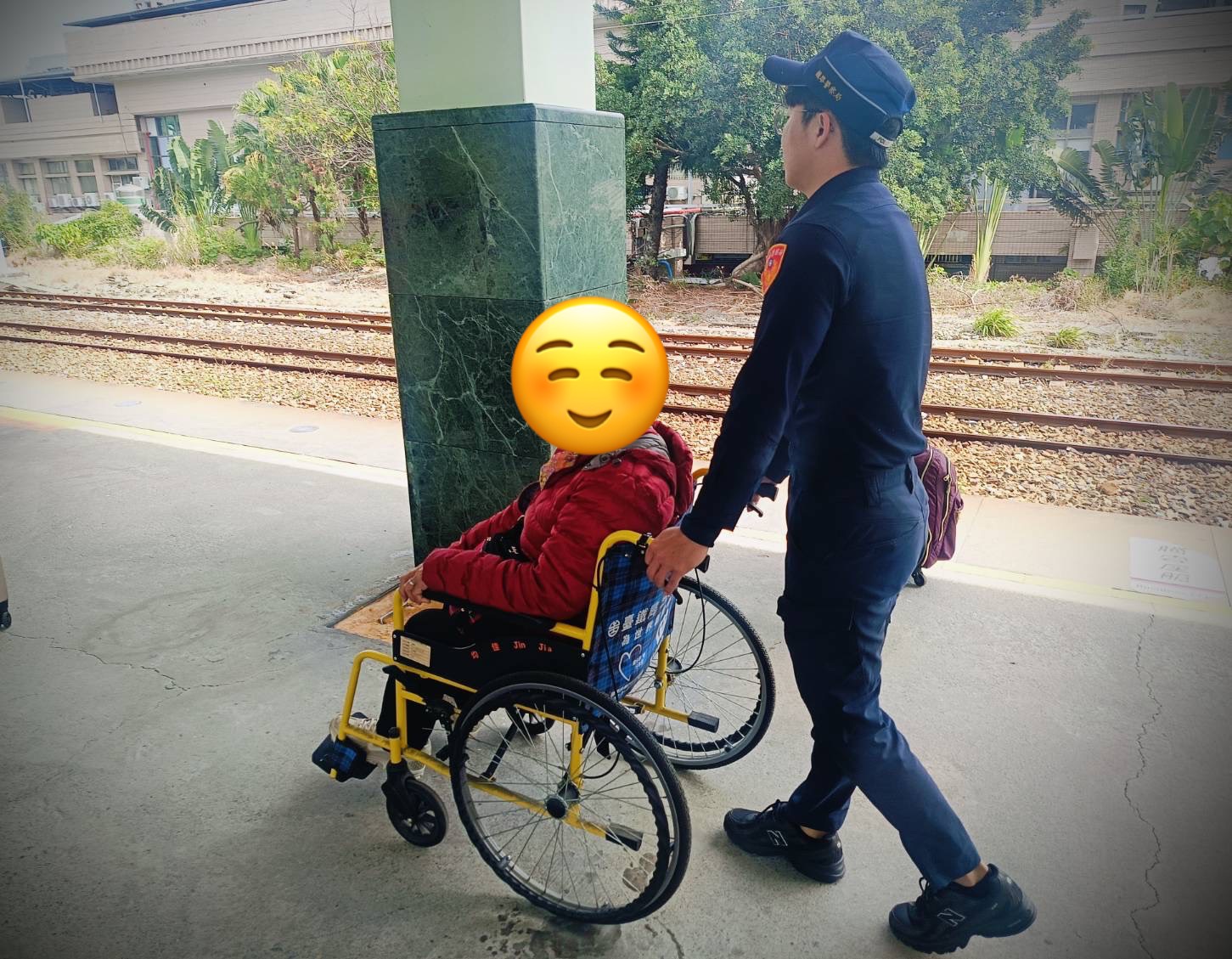 115年2月20日上午9時許,警員蔣鴻元執行勤務時於臺東站第一月台見一名身體不便老嫗於月台移動遲緩,蔣員便主動上前協助,並聯絡臺鐵服務台送來輪椅,並主動協助推送老嫗出站,老嫗對於警方的熱心協助深為感謝!